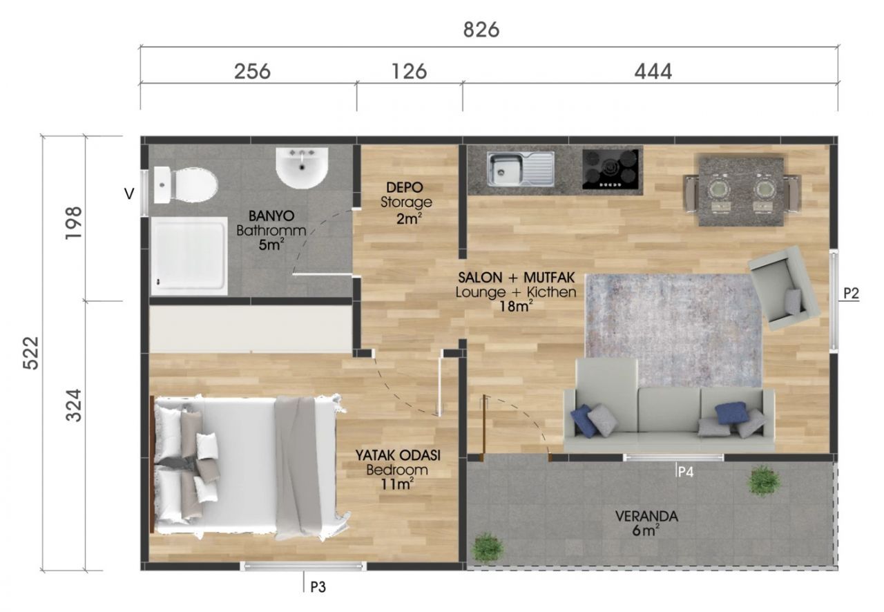 Tek katlı prefabrikler içerisinde en küçük metrekareye sahip olan 43 metrekarelik bu evimiz biroda bir salondan oluşmaktadır.